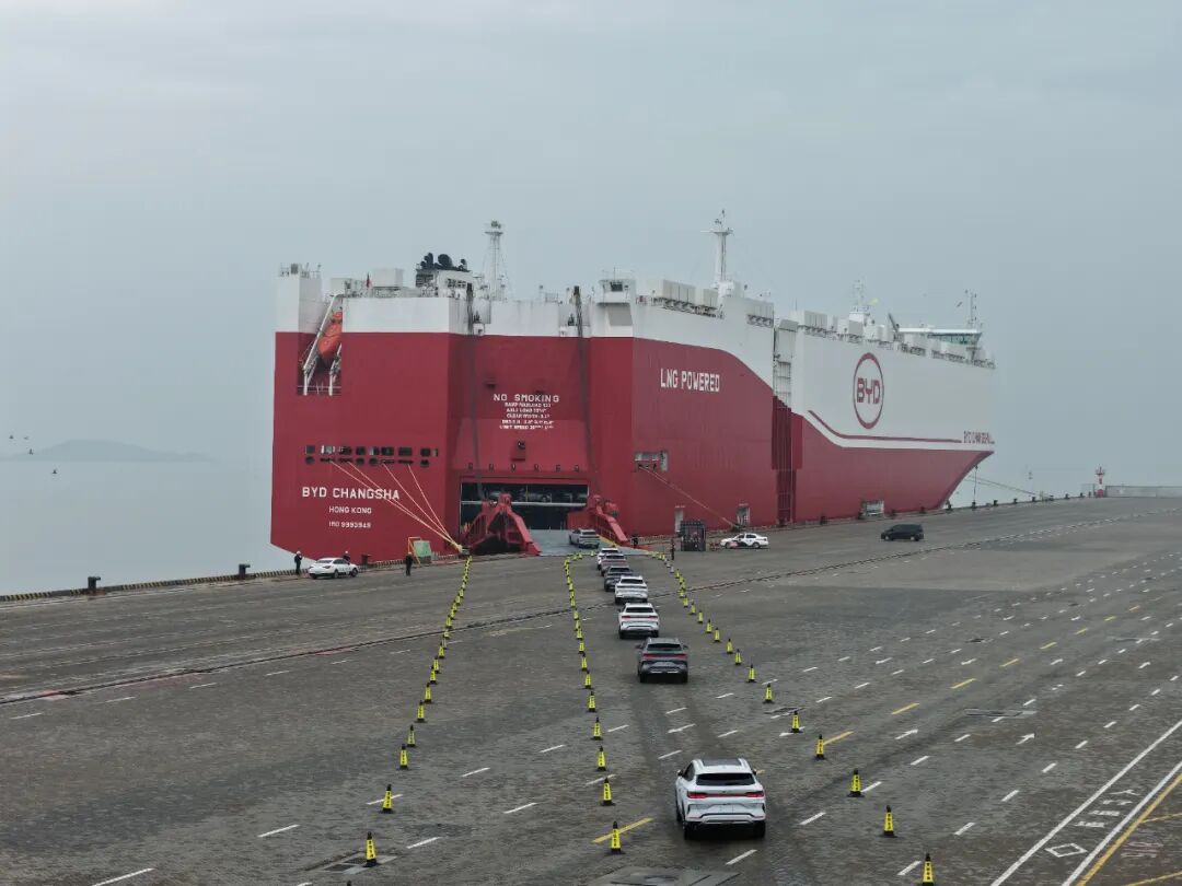 12月19日,一艘身披“BYD CHANGSHA”醒目标识的现代化巨型滚装船,装载着近千辆比亚迪新能源汽车从石湖港平稳启航,开启了这批车辆登陆德国、法国、瑞士、荷兰等欧洲核心市场的航程,意味着比亚迪首艘自有船舶在石湖港的装载作业取得圆满成功。